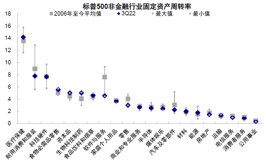 图表:三季度软件与服务、耐用消费品与服装、零售等固定资产周转率显著低于2006年以来均值