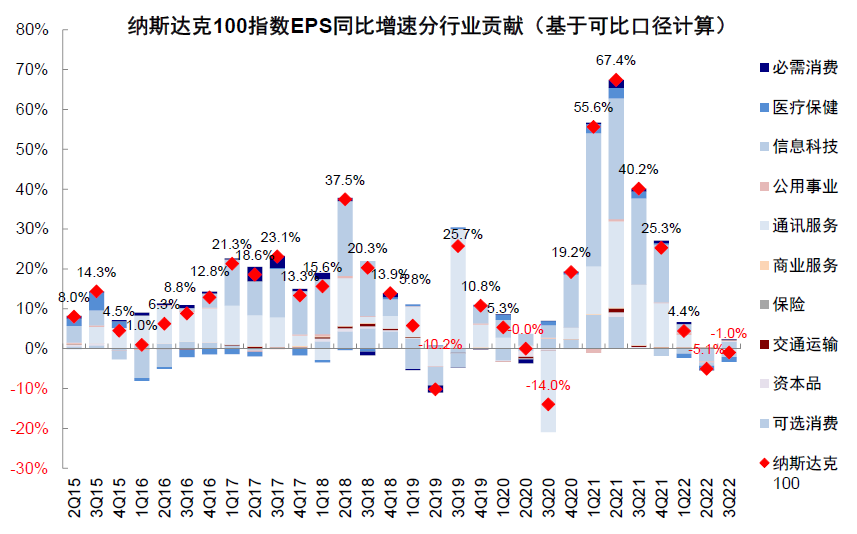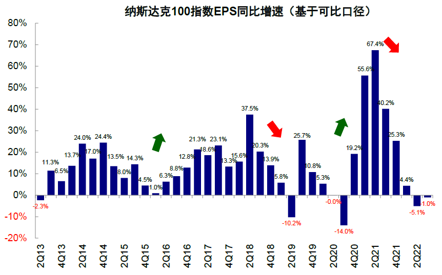图表:纳斯达克100指数EPS同比-1%,较上季度抬升
