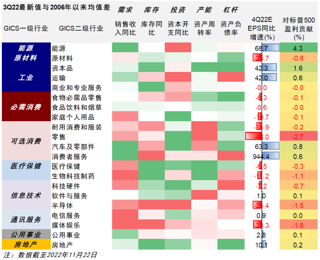 综合需求、产能利用率,库存、资本开支以及杠杆情况进行打分,我们发现半导体(需求弱、库存与投资高、杠杆高)、媒体娱乐(需求弱、库存及投资高、产能低)、电信服务(需求弱、库存及杠杆高)压力更大;零售(需求弱、库存高)和交通运输(需求尚可、但库存、投资及杠杆更高,且产能较低)同样值得关注。