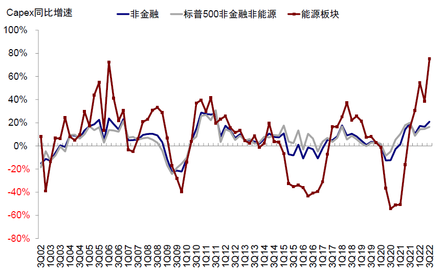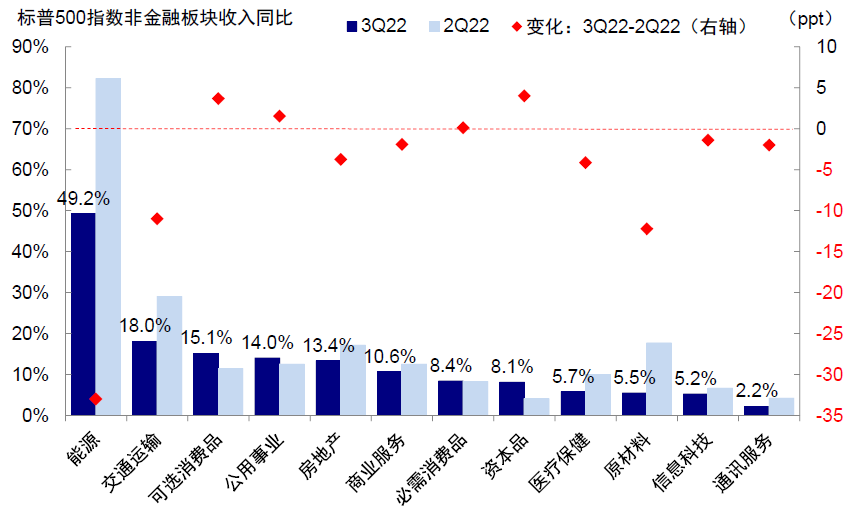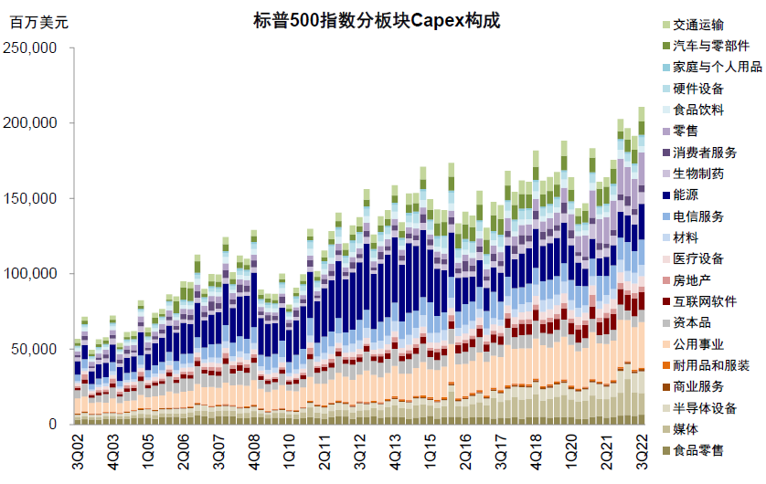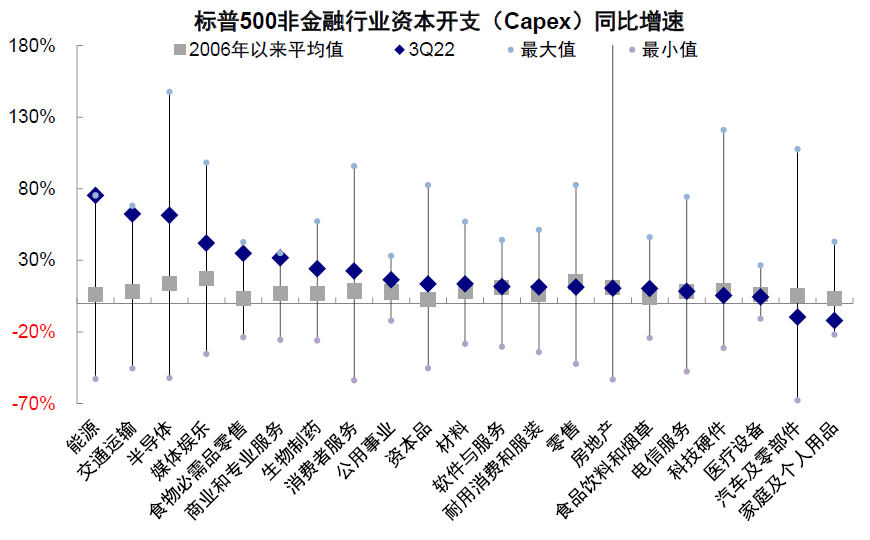 资本开支抬升,但或难掩整体放缓格局。三季度标普500非金融资本开支同比21%,较二季度17%抬升;扣除能源后资本开支同比16.4%(vs.二季度14.7%)。绝对规模同样抬升,能源、电信服务、公用事业、科技硬件、半导体等较为明显。从宏观指标看,三季度美国非住宅固定资产投资实际同比增长3.2%(vs.二季度2.4%),规模较二季度同样走高,其中无形资产和设施投资同比回落,但设备投资(三季度同比5.3%vs.二季度2.0%),尤其是信息处理设备与运输设备抬升明显,这可能与2022年8月拜登政府分别通过通胀削减法案及芯片与科学法案的促进有关(《美国中期选举的政策与市场含义》)。不过,考虑到美国增长下滑压力加大,企业资本开支意愿也可能进一步受到抑制(多个地方联储调查未来6个月企业资产开支预期自今年8月以来再度回落,《复盘美国历次衰退的历史经验》)。