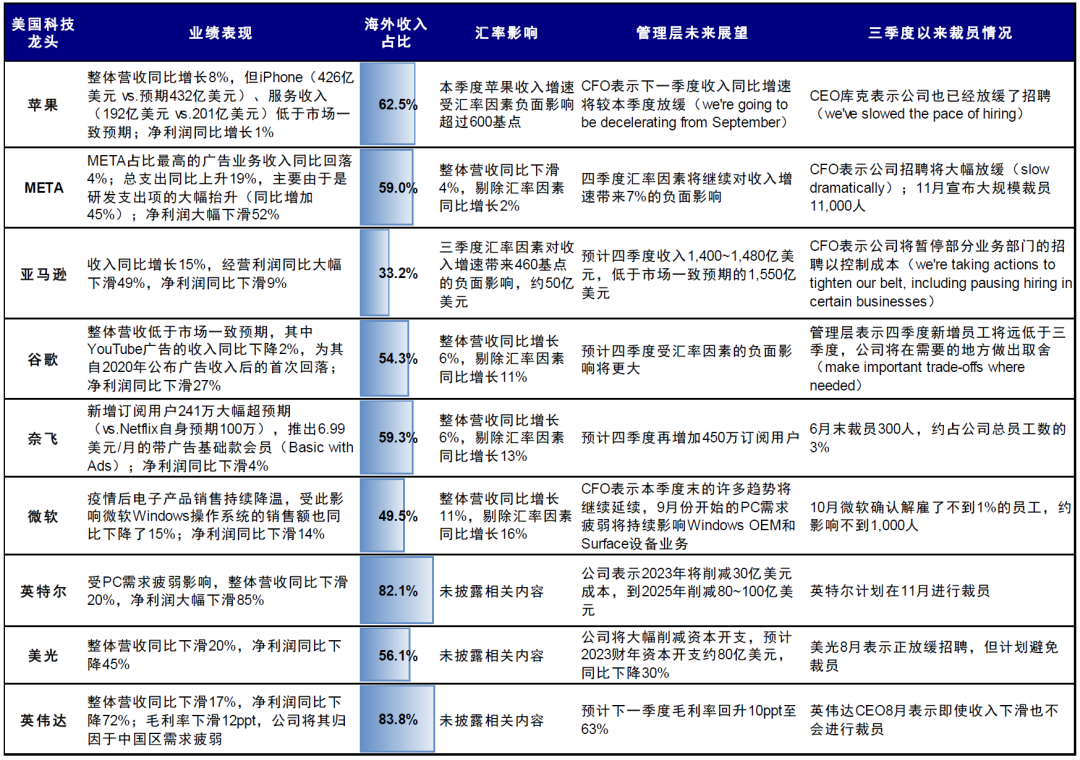 图表:美股科技龙头三季度业绩情况一览