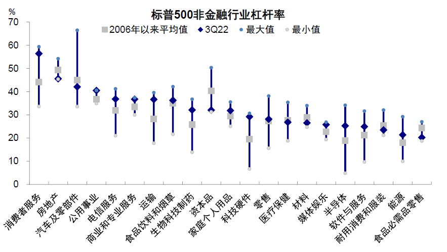图表:消费者服务、科技硬件、运输、半导体等杠杆率较2006年均值更高