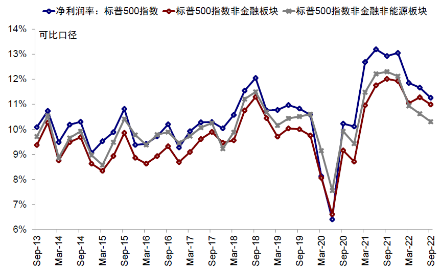 图表:三季度标普500指数非金融板块净利润率回落至11%,非金融非能源净利润率回落至10.3%