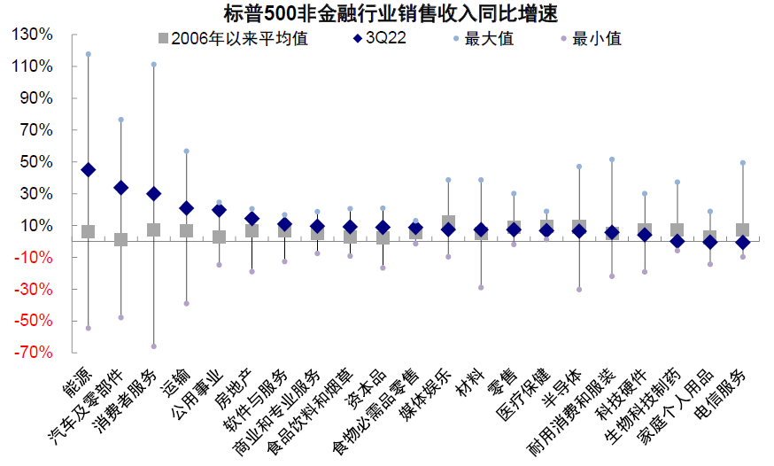 图表:三季度电信服务、生物科技与制药、媒体与娱乐销售收入同比增速显著低于2006年以来均值