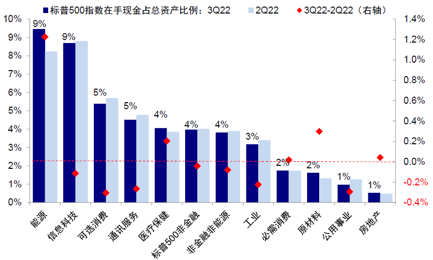 图表:能源、信息科技在手现金占总资产比例最高,但仅能源、原材料、医疗保健较上季度抬升明显