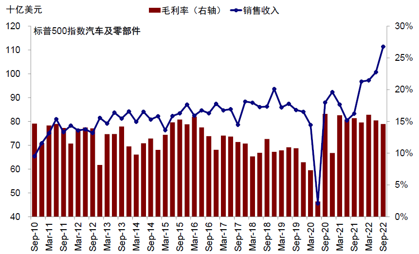 图表:三季度库存依然不足的汽车与零部件板块销售收入继续抬升,毛利率维持稳定
