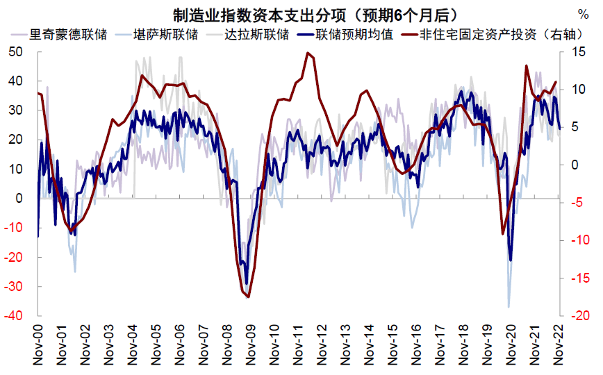 图表:多个地方联储调查的未来6个月企业资产开支预期自今年8月以来再度回落