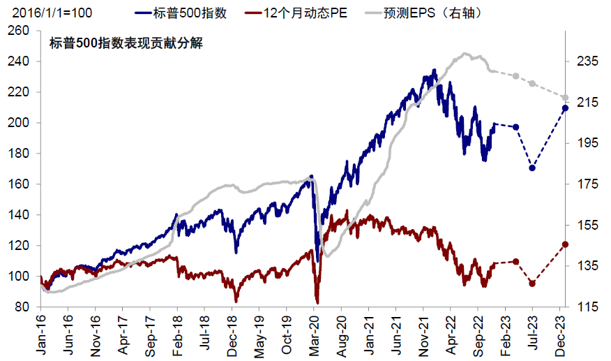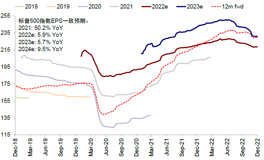 图表:当前市场一致预期标普500指数2023年盈利增速5.7%,2024年9.5%