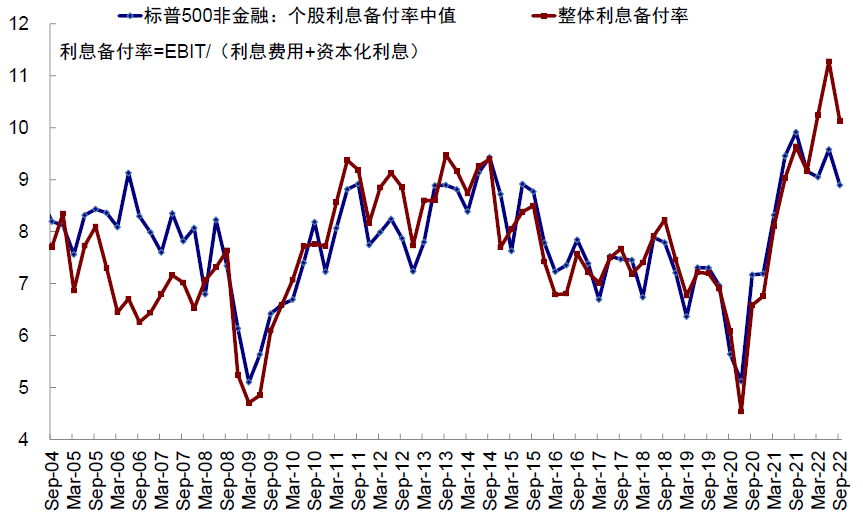 图表:三季度标普500非金融个股利率备付率中值从二季度的9.6降至三季度的8.9,整体净杠杆率亦是如此