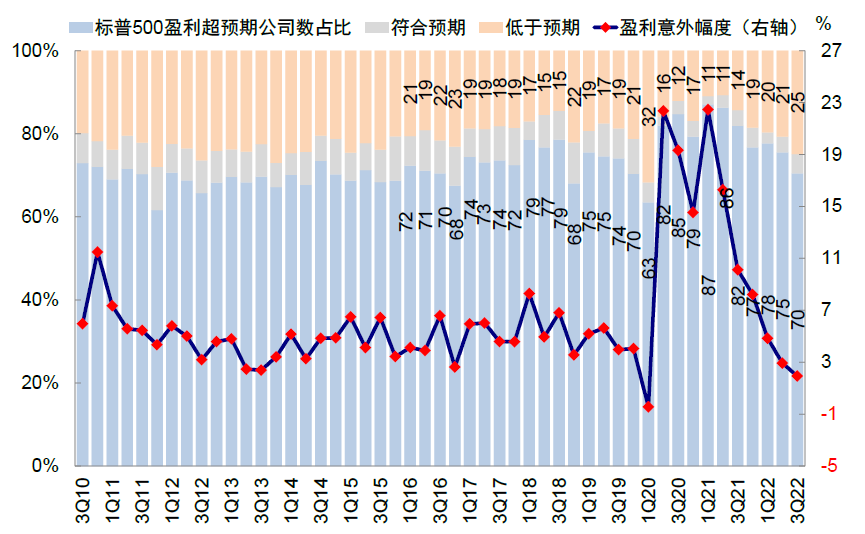 图表:三季度标普500指数盈利超预期幅度较上季度继续回落(三季度1.9% vs. 二季度2.9%),但超预期公司数占比仍达70%