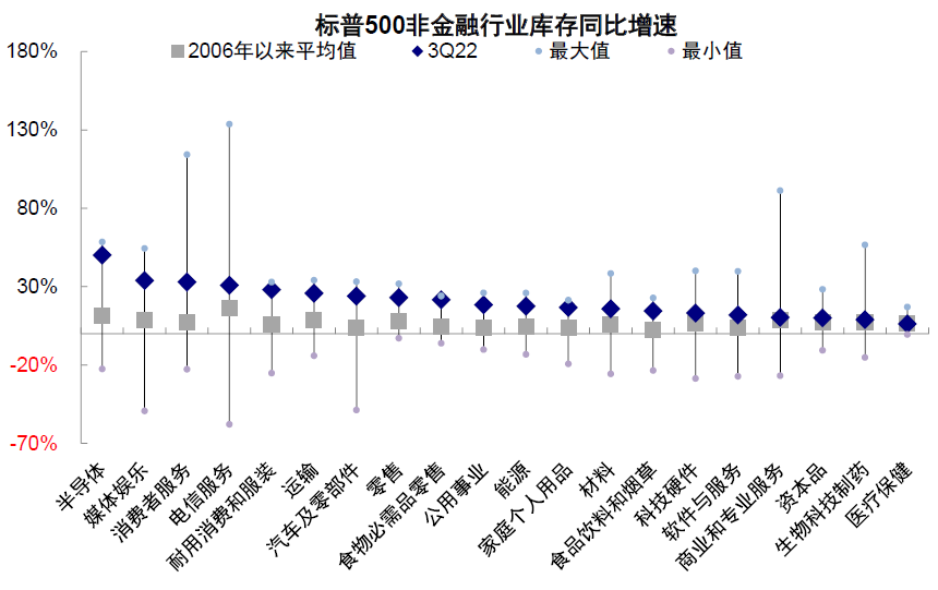 图表:相比2006年以来均值,半导体、媒体娱乐、消费者服务等库存同比增速依然较高
