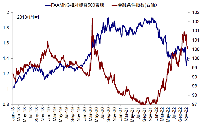 图表:FAAMNG标普500指数表现与美国金融条件有明显负相关性