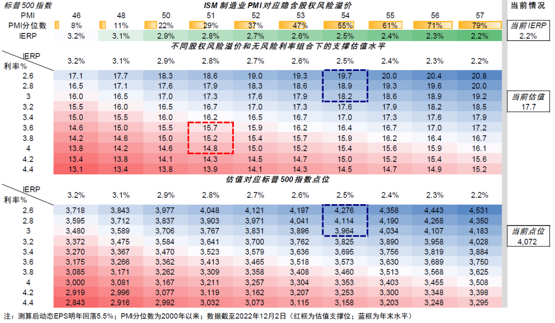 现在仍不便宜的估值叠加明年一二季度衰退压力增加,可能使美股欲扬先抑。当前标普500 12个月动态P/E为17.7倍,高于1990年以来16.2倍的历史均值。当前紧缩退坡和美债利率上行风险消除给美股提供了利率和风险偏好支撑。但明年二季度衰退压力增加下可能无法立刻得到分母端的补偿,市场波动可能倒逼出宽松预期后,美债利率的快速回落可能逐步给成长股带来更大配置时机(《推演美联储政策与资产轮动的三个阶段》)。假设股权风险溢价升至9月末低点对应的2.7%和~3.8%的10年美债利率,标普500合理估值为~15倍。我们基于增长和流动性测算的合理估值也大体相当(48%的ISM制造业PMI与~3.8%的10年美债利率对应合理估值14.5~15倍),隐含支撑位较当前低10~15%。但我们预计年底点位比当前高~5%(《海外市场2023年展望:欲扬或需先抑》。)