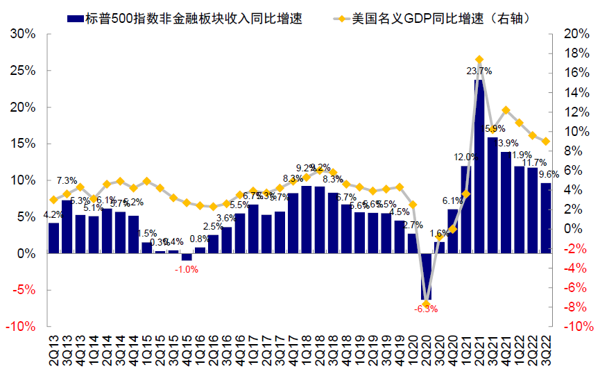 图表:三季度标普500指数非金融收入同比回落至9.6%,与名义GDP增速回落趋势基本一致