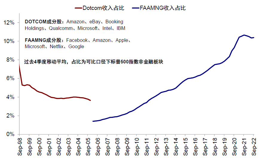 图表:FAAMNG收入占标普500非金融比例从2021年9月10.7%高位回落至三季度10.4%