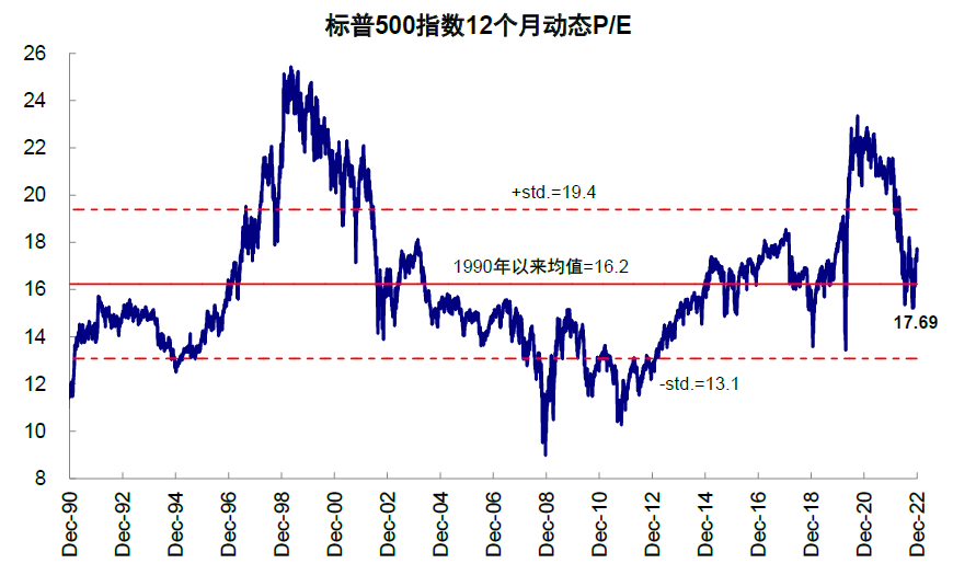 图表:标普500指数12个月动态估值17.7倍,高于1990年以来均值