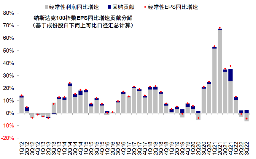 图表:纳斯达克100回购对经常性EPS增速贡献约2.4%,较二季度的2.2%继续抬升
