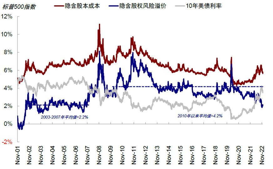 图表:标普500指数隐含股权风险溢价已回落至2.2%的相对低位