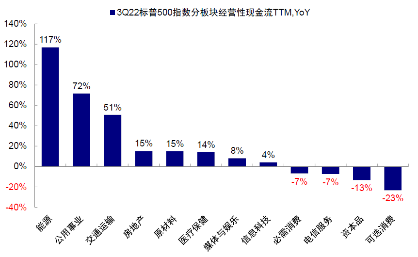图表:能源、公用事业、交通运输板块经营性现金流同比领先,但可选消费、资本品同比落后