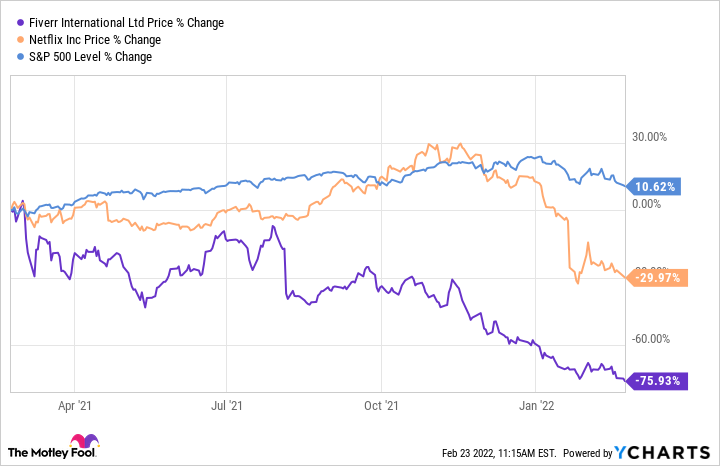 That's why investors shouldn't worry too much about the current volatile state of the market. Even if the market keeps dropping, that merely presents opportunities for investors to purchase shares of excellent stocks for a discount. With that as a backdrop, let's look at two stocks that have gotten hammered lately but could still provide above-average returns in the next decade: Fiverr International and Netflix.