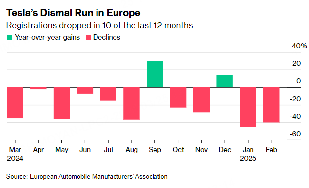 Tesla Inc.’s sales have fallen in 10 of the last 12 months in Europe, with the carmaker struggling mightily at the beginning of this year.The Elon Musk-led company registered 16,888 new cars in ...