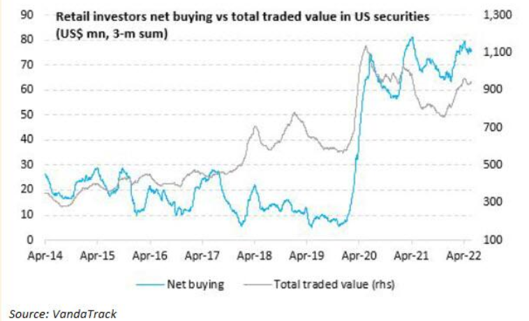无论是曾经的美股散户投资者因凭一己之力推动Meme股上涨而一战成名,还是在美联储5月初宣布二十多年来最大幅度加息次日纳指和道指分别创2020年6月以来最大跌幅后,散户大举逢低买入达到接近创纪录的水平,美股的至暗时刻里总能见到散户的身影。