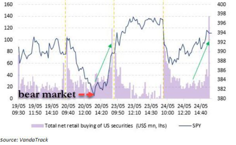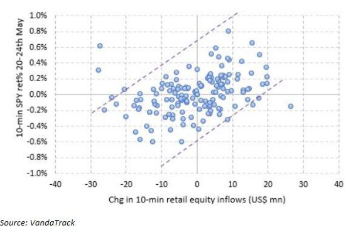 那么下一个问题自然而然就来了,多少散户护盘才能让美股大反弹?根据Vanda的说法,散户净买入数据与标普500指数的日内价格走势显示出高度的相关性,1000万美元的散户净买入的变化使股票平均移动了大约20个基点,至少在过去3个交易日是这样。