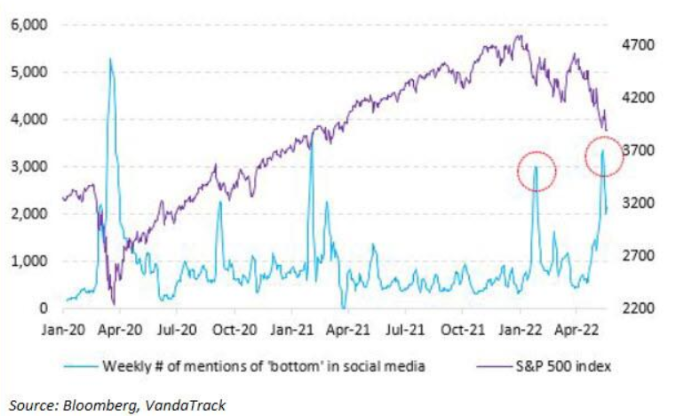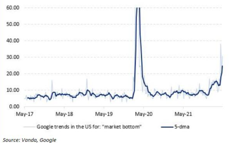 来自社交媒体的其他情绪指标似乎证实,散户投资者仍然专注于买入跌停板。正如Vanda所指出的,在WSB子版块中,与 "市场底部 "相关的评论和主题数量已经增加到去年1月的高点,这表明投机性的散户投资者在目前的水平上再次看到市场底部的迹象(也就是说,水平远远低于2020年3月本周期真正的市场底部)。