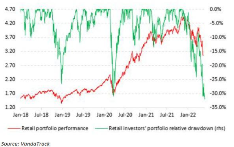 根据追踪美国散户交易流量的研究机构Vanda Research最新的数据显示,散户投资者的净流入金额处于历史高位附近,在最近的三个月里,散户投资者购买了价值760亿美元的股票,平均每天有13亿美元。而同时,散户们的投资组合平均缩水32%,也是自2014年Vanda跟踪数据以来的最差表现。