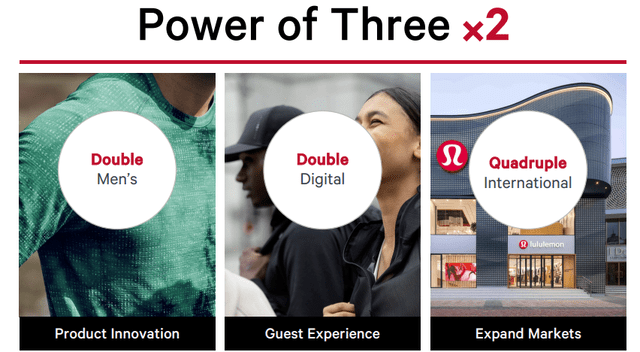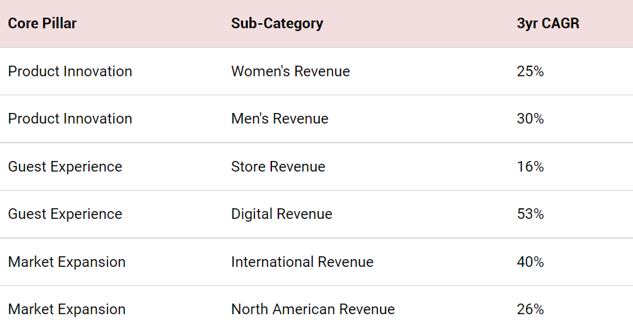As depicted by the chart below, LULU continues to generate robust growth across all three pillars to achieve its aggressive growth target.