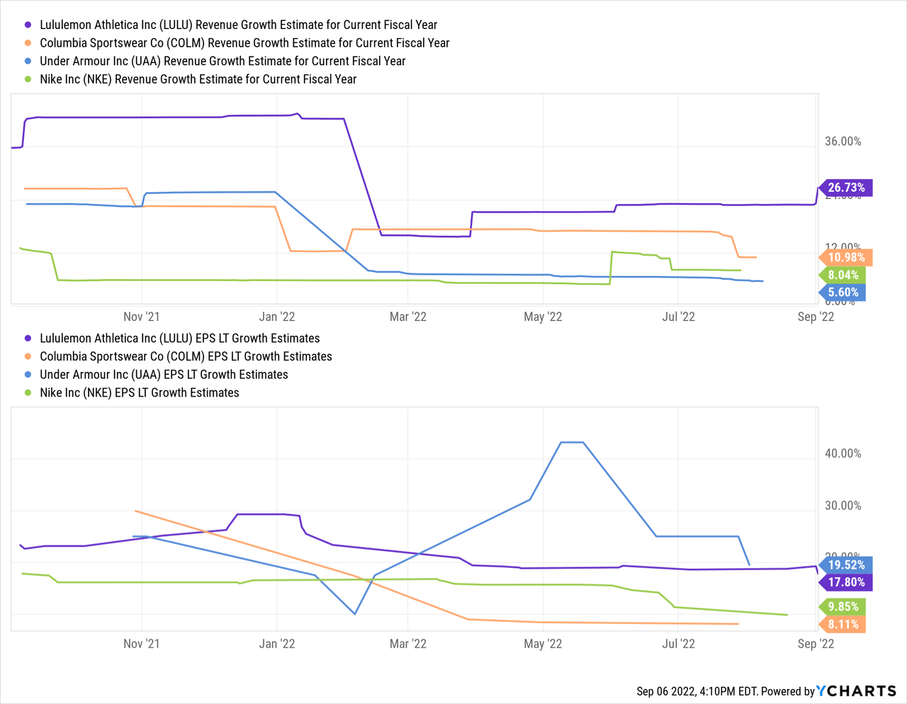 As mentioned in my first LULU piece, its peer group is identified as the following: NIKE (NKE), Under Armour (UAA), and Columbia Sportswear (COLM).