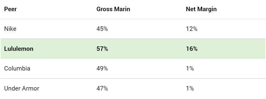 Ending the quarter with 57% gross margins and 16% net margins, LULU continues to dominate its financial benchmarks relative to its athletic apparel peers.