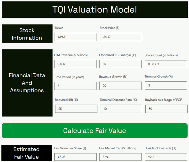 To find the fair value and expected return of Upstart, we will use TQI's Valuation model: