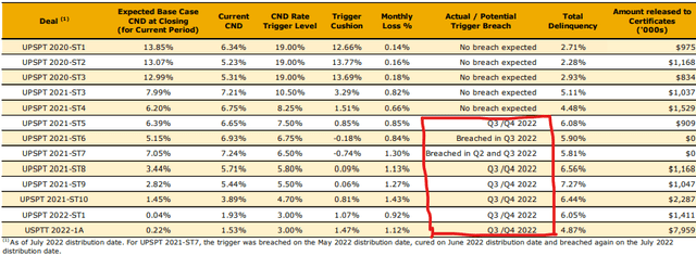 The Ugly: In my analysis of Upstart's Q2 results, I highlighted the fact that its credit performance data for 2021 cohorts was unimpressive. And recent data from KBRA shows that many of Upstart's ABS securitization trusts have recently suffered (or are set to suffer) trigger breaches [Current Cumulative Net Defaults [CND] > Expected CND].