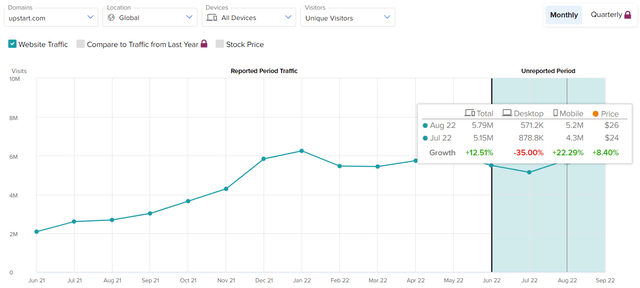 Another concerning data point I have come across is Upstart's website traffic. While total traffic grew by 12% y/y in August, Desktop views tanked by ~35%. Rising interest rates are set to lower the demand for loans and impact Upstart's conversion rates (as seen in Q2). As a result, Upstart's lending activity may continue to contract for the foreseeable future.