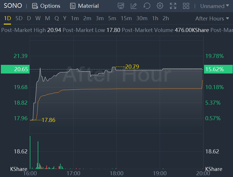 Sonos (SONO) posted 57 cents of earnings per share on $673 million in revenue, ahead of expectations for 38 cents on $594 million in revenue. The stock was up 15.6% after the release.