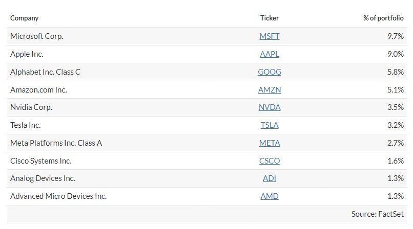JEPQ posts its full list of holdings every day. The ETF holds 77 stocks, which make up 81% of its portfolio. Technology stocks make up about 40% of the portfolio.
