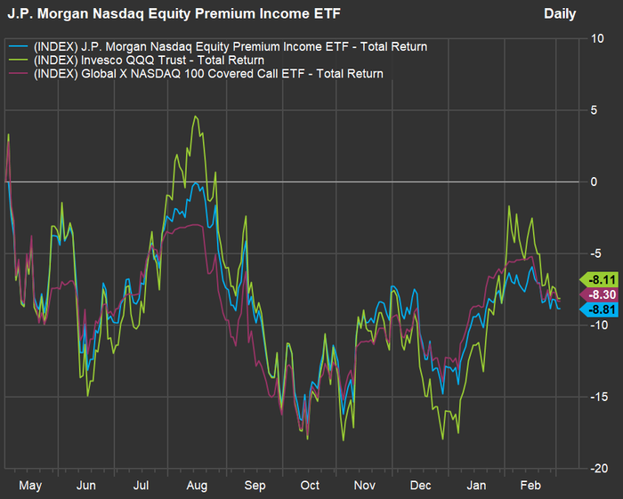 JEPQ is less than a year old, a short period for a fund, although growing to $1.6 billion since the fund was launched on May 3 underlines how quickly investors have warmed to the strategy. For a benchmark comparison, here's how the fund has performed on a total return basis, with dividends reinvested, against QQQ and QYLD since inception: