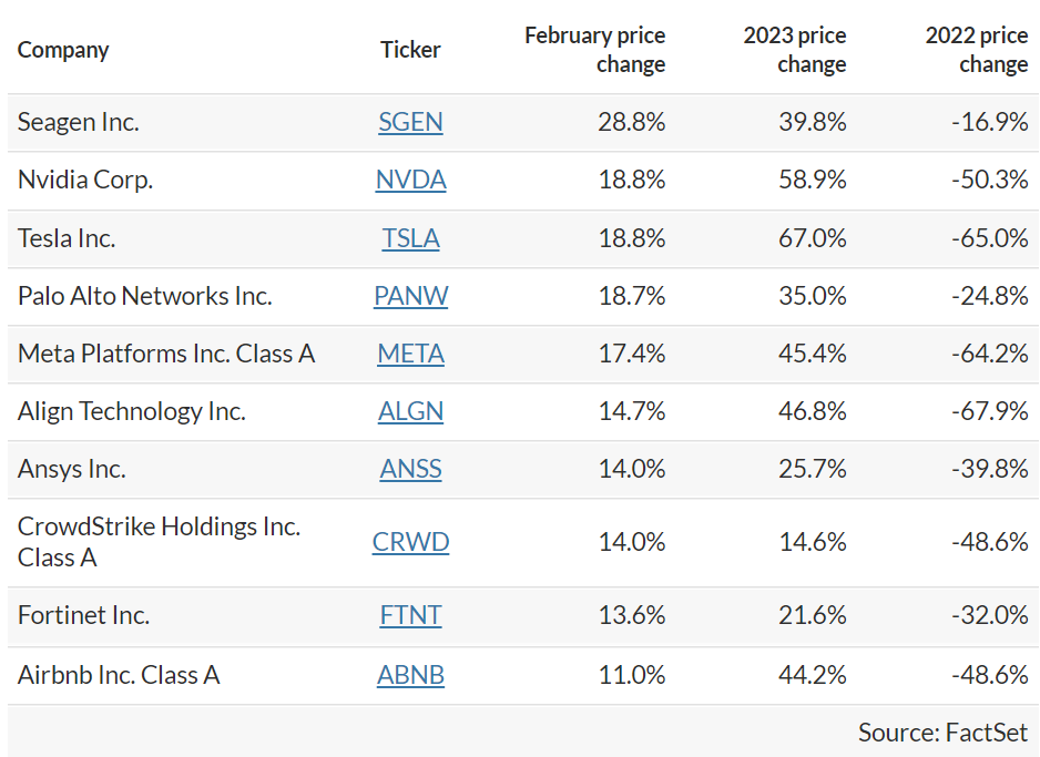 That said, some of the stocks that were hit hardest during 2022 have continued to bounce back. For example, Tesla Inc. (TSLA) shares rose 19% in February and are now up 67% for 2023, following their 65% plunge last year. Similarly, shares of Nvidia Corp. (NVDA) were up 19% for February and up 59% for this year, following a 50% decline in 2022.