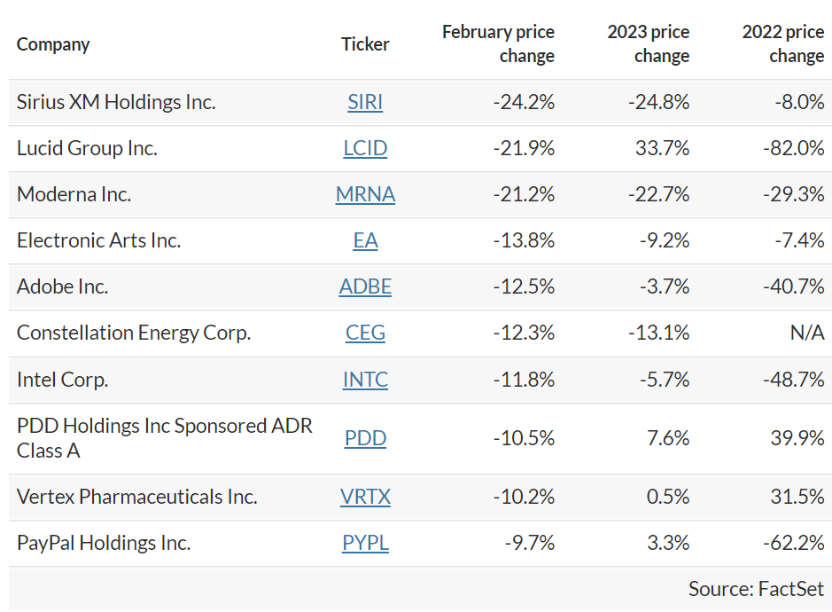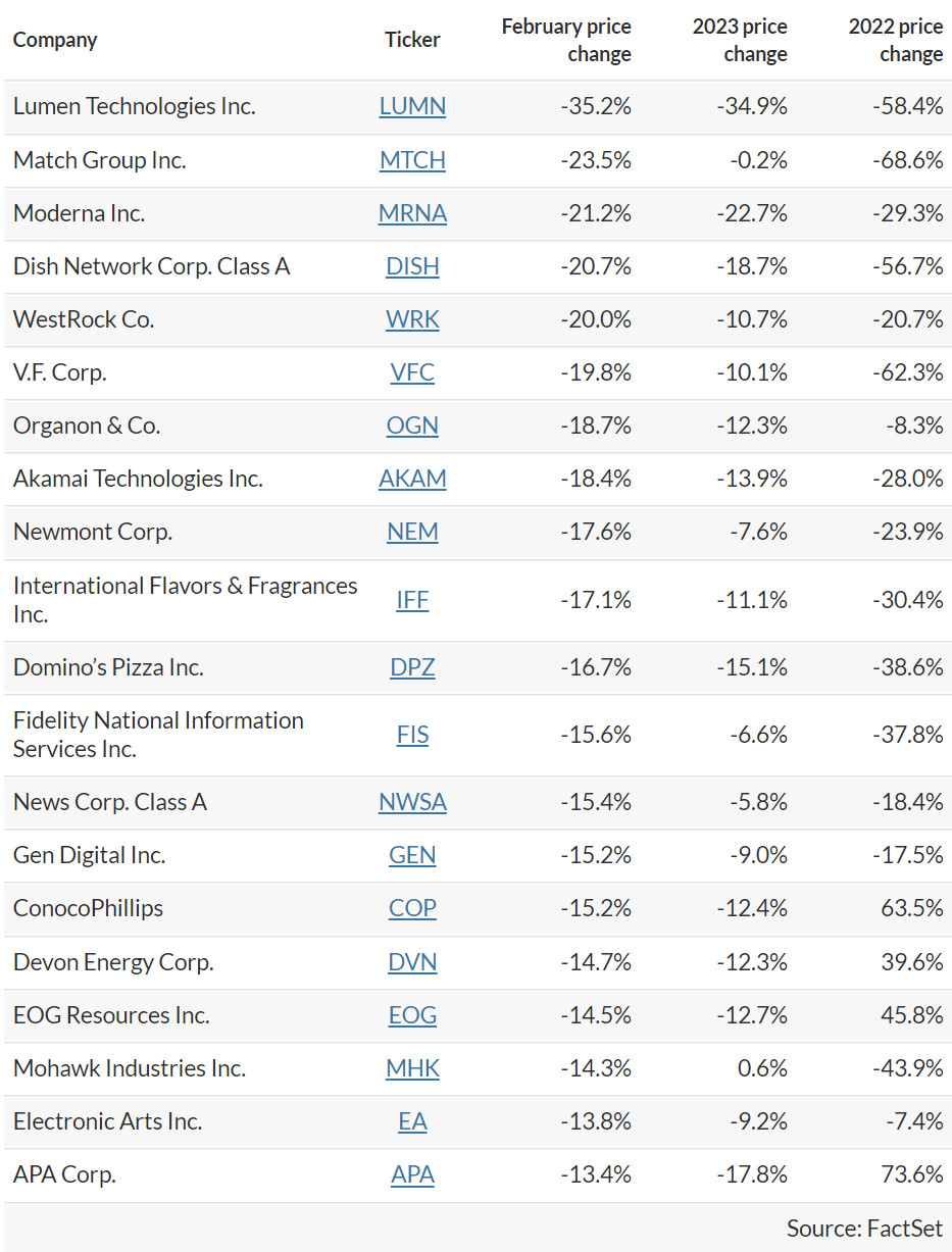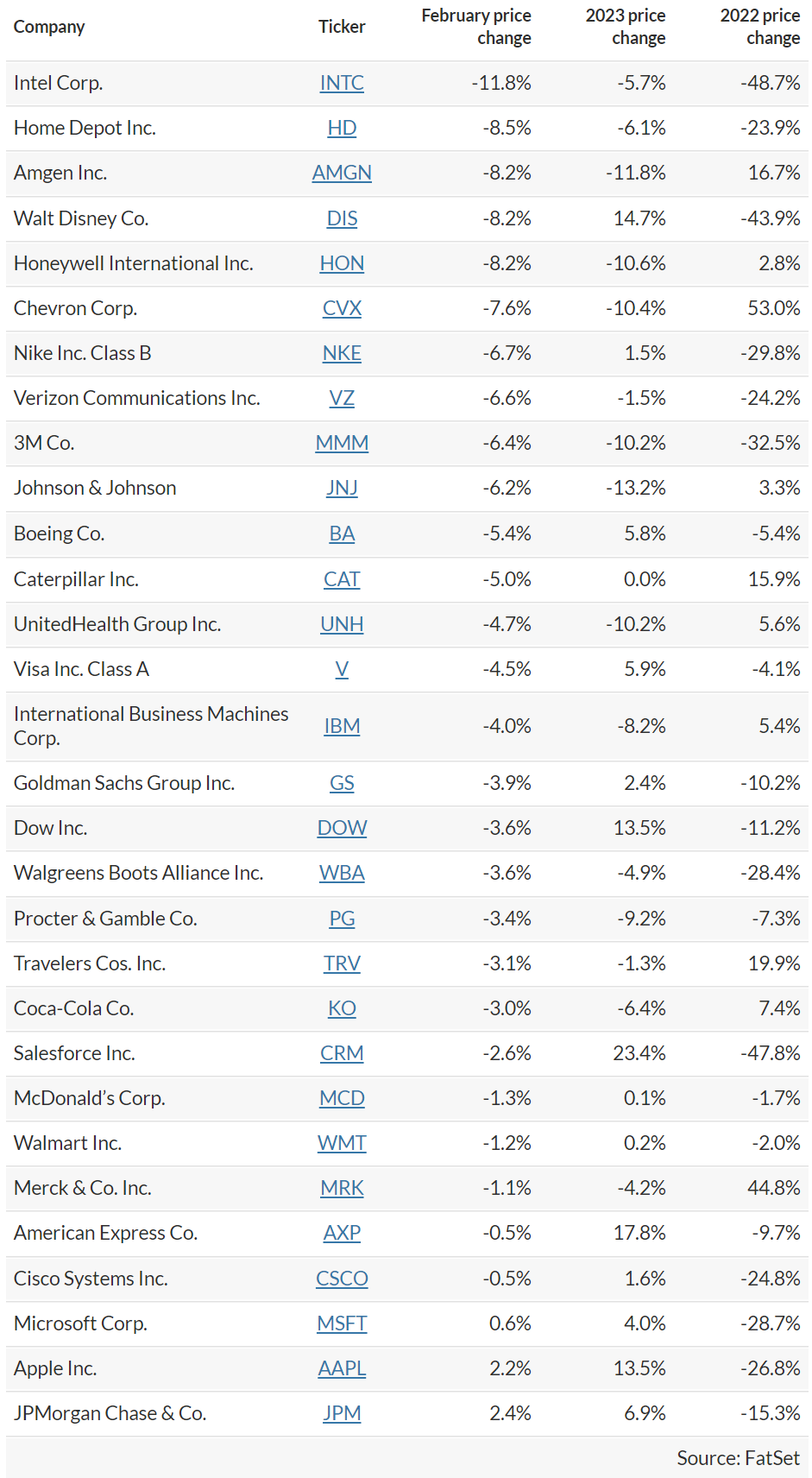 The Dow Jones Industrial Average pulled back 4.2% for the month, though it was down only 1.5% for 2023. All but three of its 30 of its components declined in February: