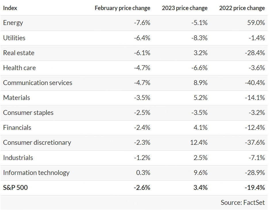 The energy sector was the worst performer of February, while the information technology sector was the only one to show a gain.