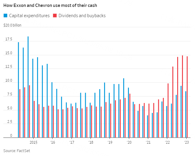 By June 2020, as the pandemic brought parts of the country to a standstill, Chevron and Exxon Mobil had together devoted more cash to capital expenditures than shareholder returns for at least 28 straight quarters, according to FactSet. The ratio has been the opposite every quarter since, with the companies paying out $14.8 billion in dividends and buybacks in the first three months of this year, compared with $8.4 billion in capital investment.