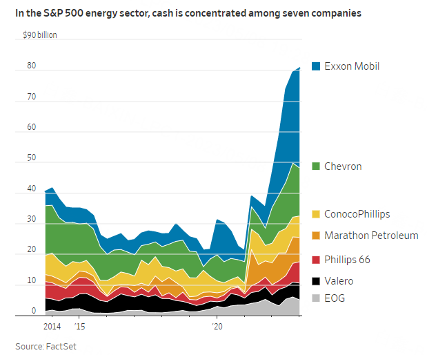 Six companies often described as Big Oil -- Italy's Eni, France's TotalEnergies, the U.K.'s Shell and BP, and domestically headquartered Chevron and Exxon Mobil -- reported nearly $160 billion in cash and cash equivalents across their balance sheets at the end of the first quarter. State-owned companies and smaller businesses have tens of billions more.