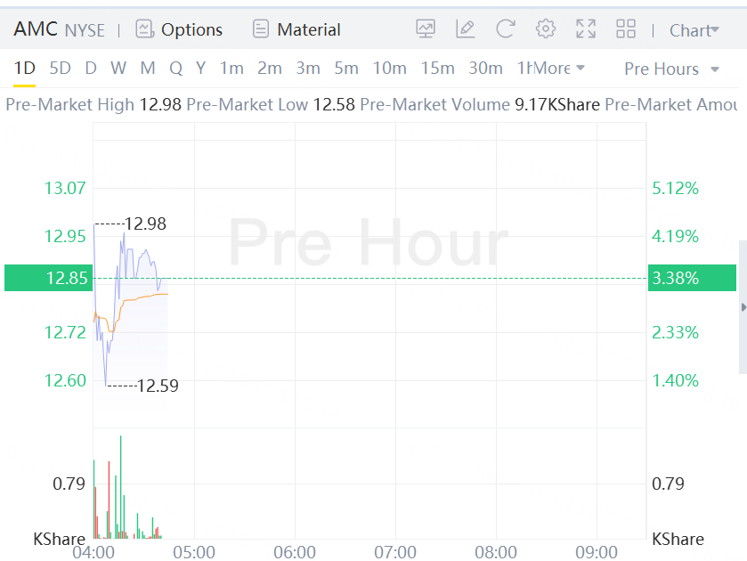 Shares of AMC Entertainment Holdings Inc. rose 3.38% in premarket trades Monday.