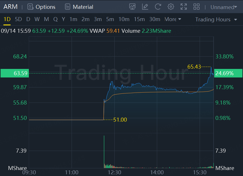 The stock, which had opened at $56.10, notched a 24.69% gain to close at $63.59, giving the British chip designer a valuation of $65 billion in its return to public markets following a seven-year absence. The IPO had priced at $51.