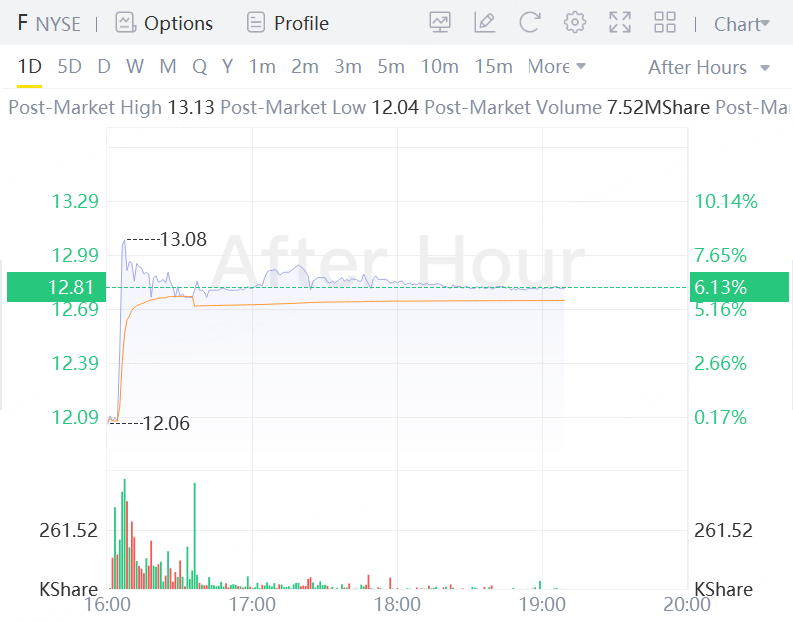 Ford Motor Co.'s stock soared more than 6% in the extended session Tuesday after the carmaker reported quarterly revenue above Wall Street's expectations and played up the growth of its hybrid-vehicle business.