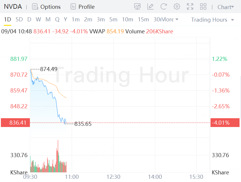 Nvidia shares were down 4.01% at $836.41 in morning trading.