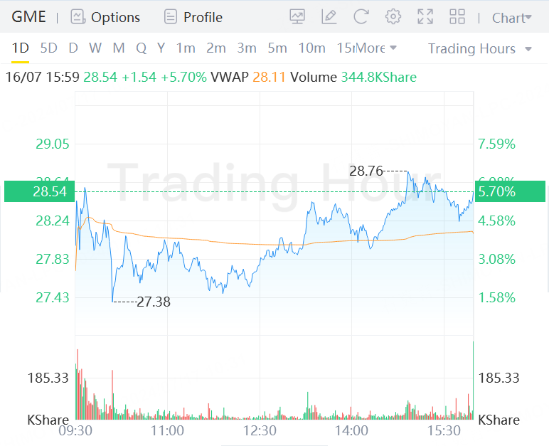 The stock was up 5.7% on Tuesday. It's up 63% for the year, although its trading volume has subsided substantially since trader Keith Gill, better known as Roaring Kitty, reappeared in mid-May after about three years offline.