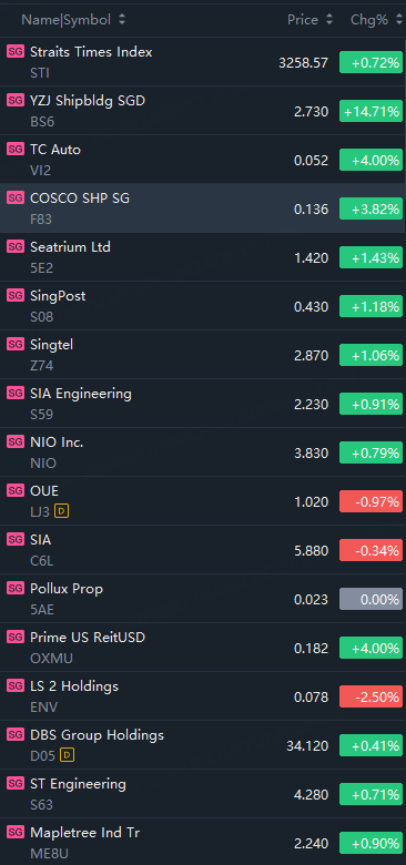 In company news, shares of YZJ Shipbldg SGD surged nearly 15% after the company disclosed a 77% increase in attributable profit to 3.06 billion yuan for the first half of 2024.