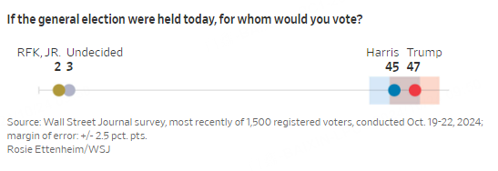 The national survey finds that Trump is leading Harris by 2 percentage points, 47% to 45%, compared with a Harris lead of 2 points in the Journal's August survey on a ballot that includes third-party and independent candidates. Both leads are within the polls' margins of error, meaning that either candidate could actually be ahead.